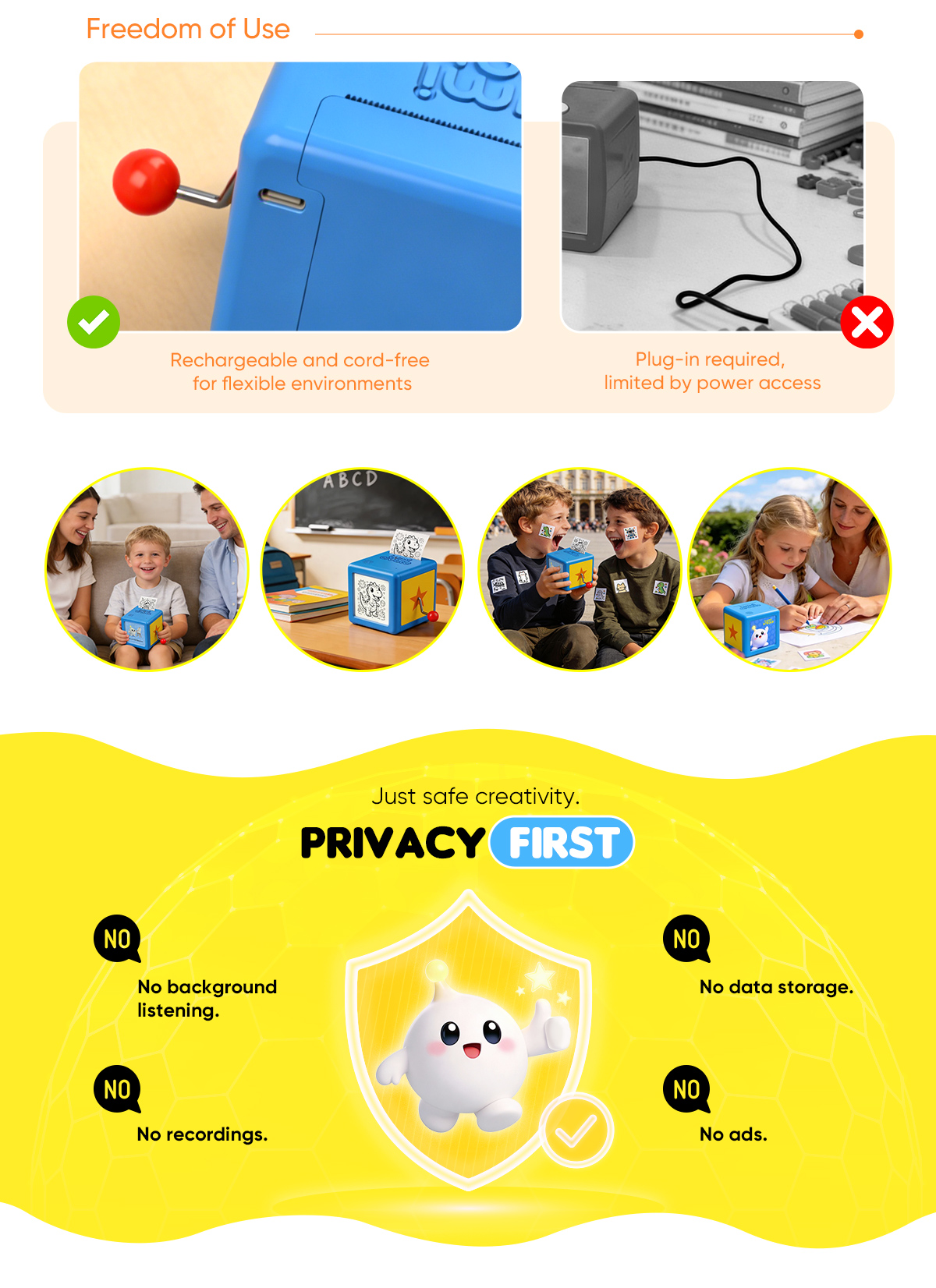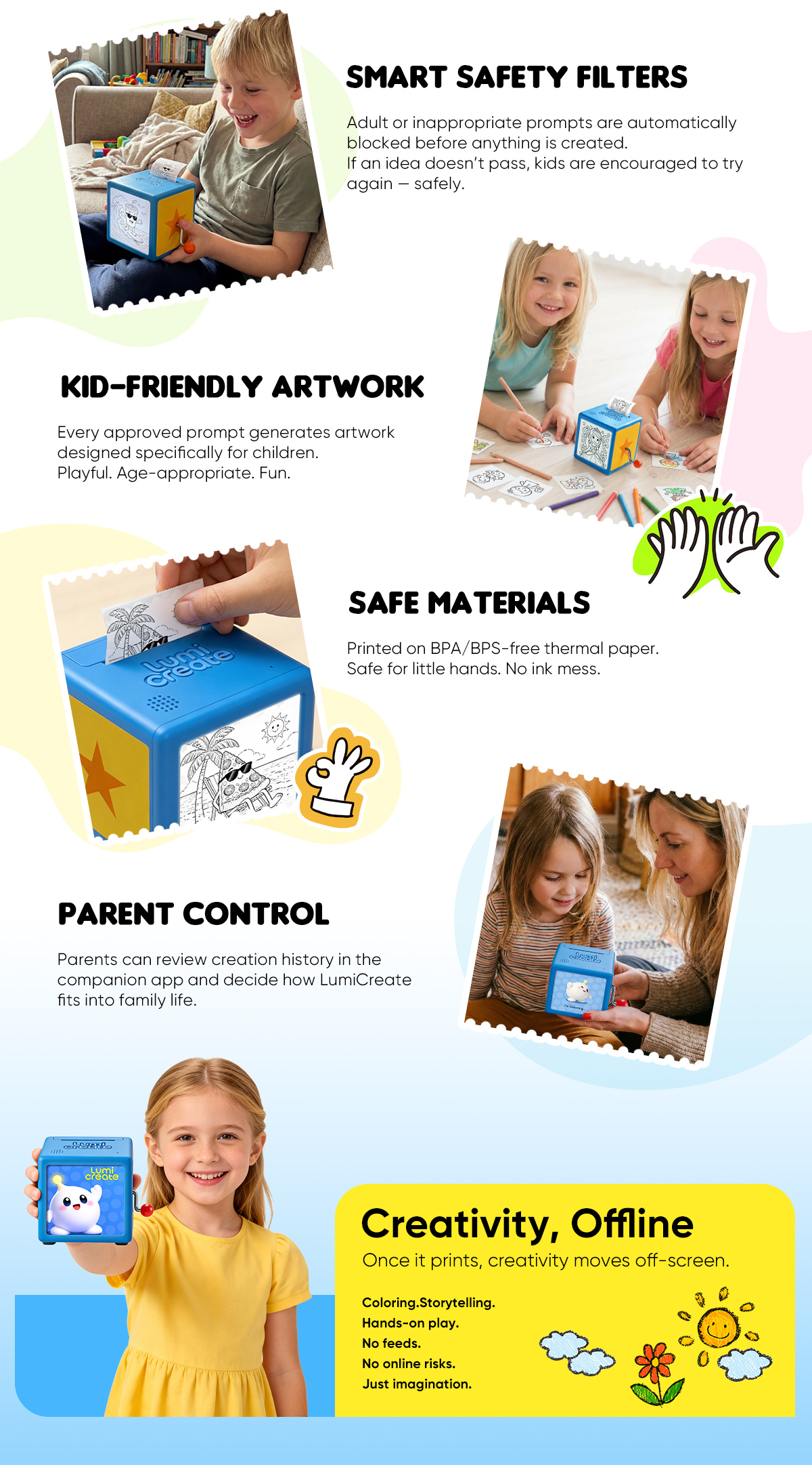 • Built-in AI safety filters to ensure age-appropriate and friendly content